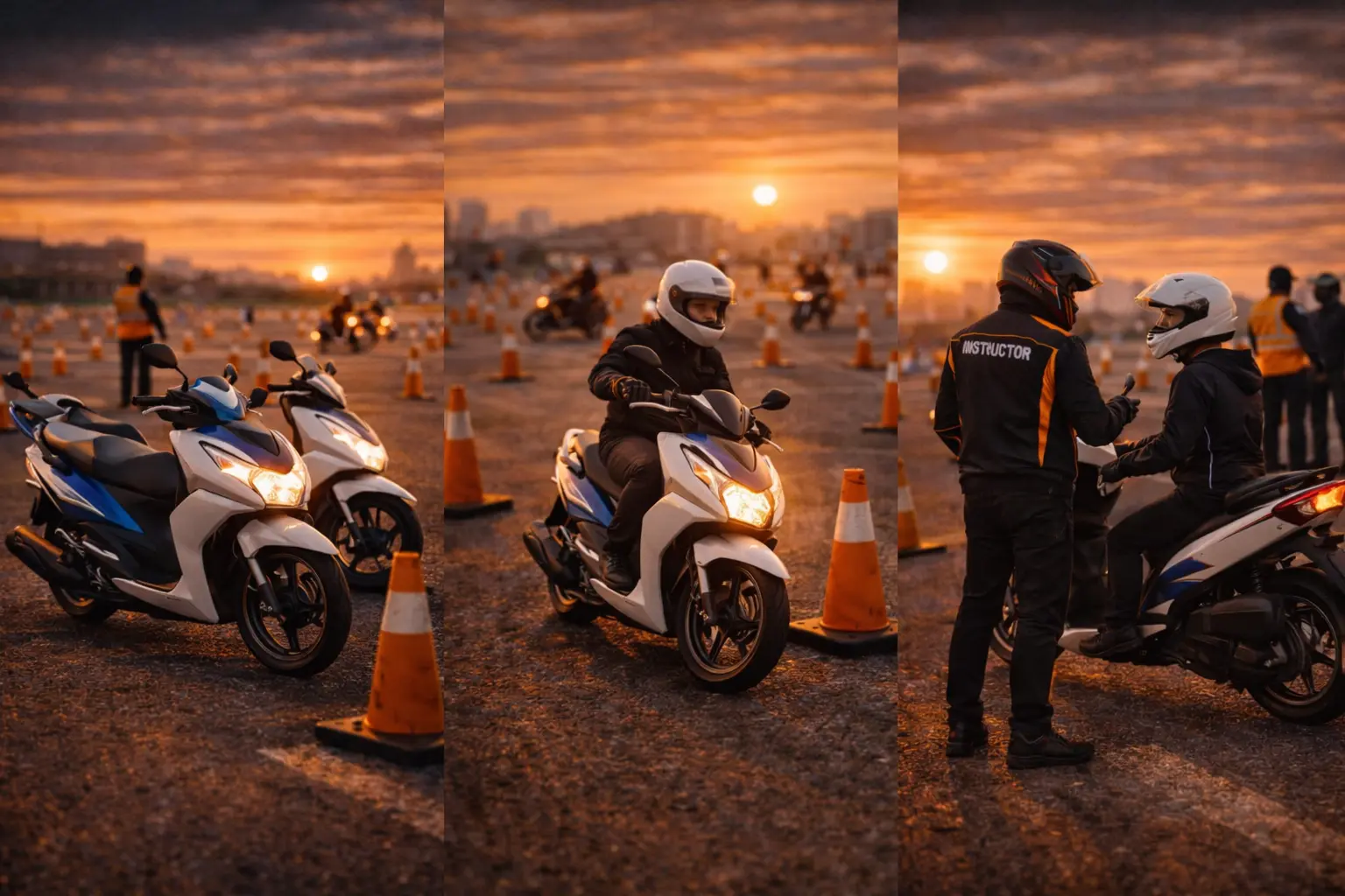Poziție, privire, accelerație fină, frânare progresivă, viraje, slalom, opriri controlate. Scopul: să nu “te sperie” scuterul, ci să îl conduci clar.